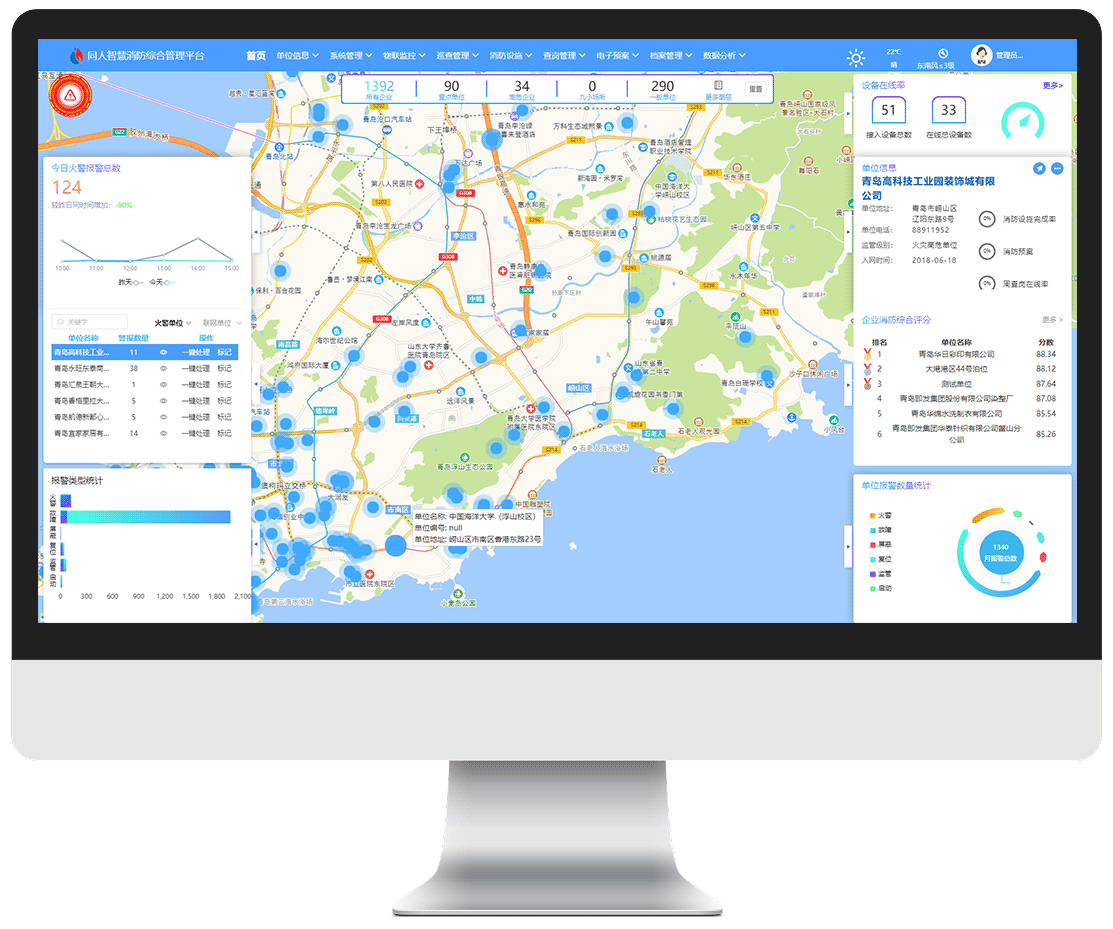 同人智慧消防综合管理平台是集消防物联、安防物联和消防安全管理于一体的综合管理平台,以消防物联监控数据为基础,同时配备巡查管理、电子预案、消防设施管理、培训考试、数据分析、消防档案等若干消防安全管理模块,各模块功能独立、数据互通,真正成为用户的得力助手。